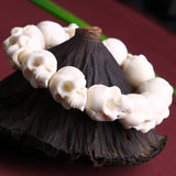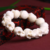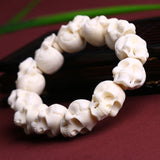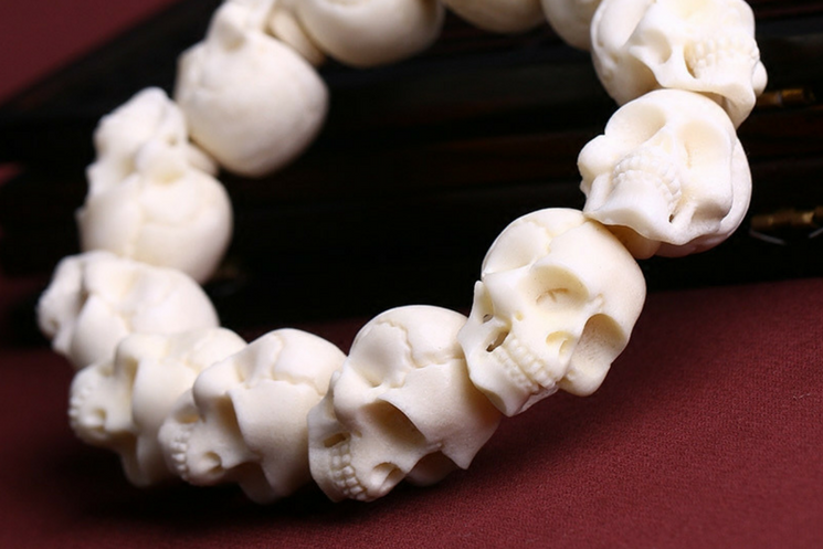 ☠ 12 pieces of handcrafted bone sculpture skulls bracelet, the ultimate badass accessory for the kick-ass devils. Made of naturally-shed deer antlers from ethically farmed source, hand tuned to resemble the skull texture and hand carved to the finest realistic details ( the cracks, the teeth, the marks), It's truly devilish to the bone.