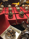 ☠ This Mexican Sugar Skull ring is an absolute eye catcher with mesmerizing blue amber eyes to dazzle. Featuring hand etched details with vibrant two-tone brass overlay, this is statement piece you'd be proud to wear.