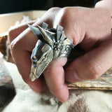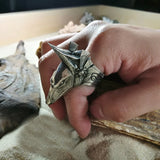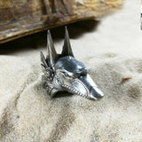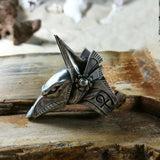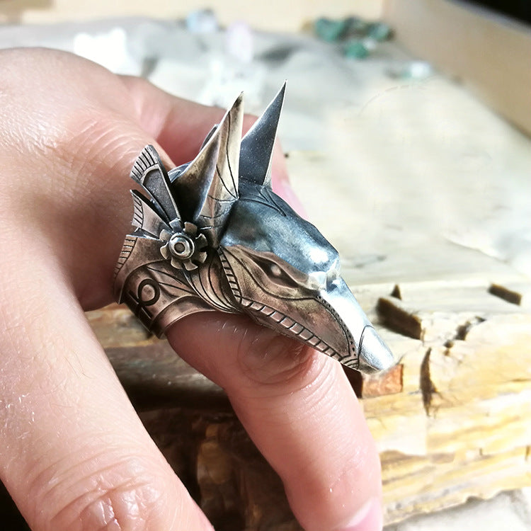 ☠ Like the God of Death with tremendous spiritual and physical power, this otherworldly Egyptian God Anubis silver ring radiates mystic aura.Handcrafted to the devil's details, the killer razor sharp horns, the mystical markings, this ring is simply from the underworld. Under the spell of this absolute ruler of the underworld, you are bound to turn a lot of heads and steal a lot of hearts. Wear at your own risk.