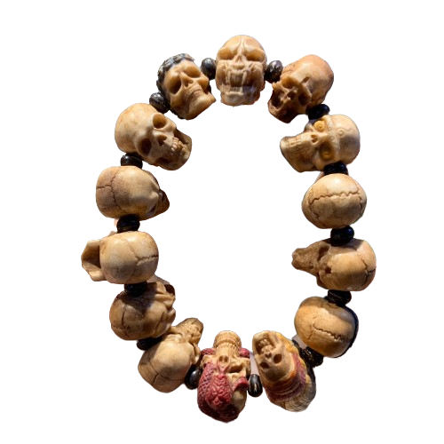 ☠ Unleash your bold style with our Deer Antler Tribal Sugar Skull Bracelet, a unique fusion of rustic charm and edgy design. This handcrafted bracelet features intricately carved sugar skulls, a symbol of life and remembrance, made from genuine deer antler. Each skull showcases exquisite tribal patterns, making every piece a distinctive work of art. The natural variations in the antler's texture and color add a touch of wild authenticity, ensuring no two bracelets are alike from the handmade craftsmanship.