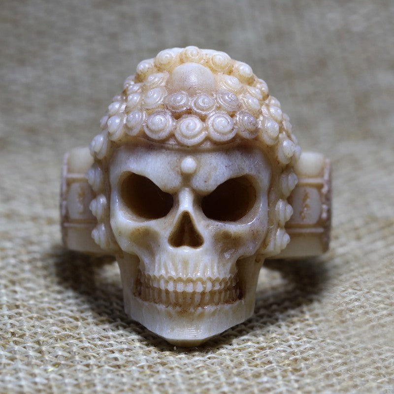 ☠ Intricately crafted and hand tuned with stunning details, this Buddha & Demon Skull Mantra deer antler ring is a true eye-catcher. The Buddha skull face oozes ancient mystical aura and it's believed in Buddhism to ward off evil spirit. The hand carvings of six-syllabled mantra "Auṃ maṇi padme hūṃ"ཨོཾ་མ་ཎི་པདྨེ་ཧཱུྃ in Tibetan on the ring complete this devilish piece of wearable art, it truly reflects the symbol of the Buddha skull: from impurity to enlightenment.